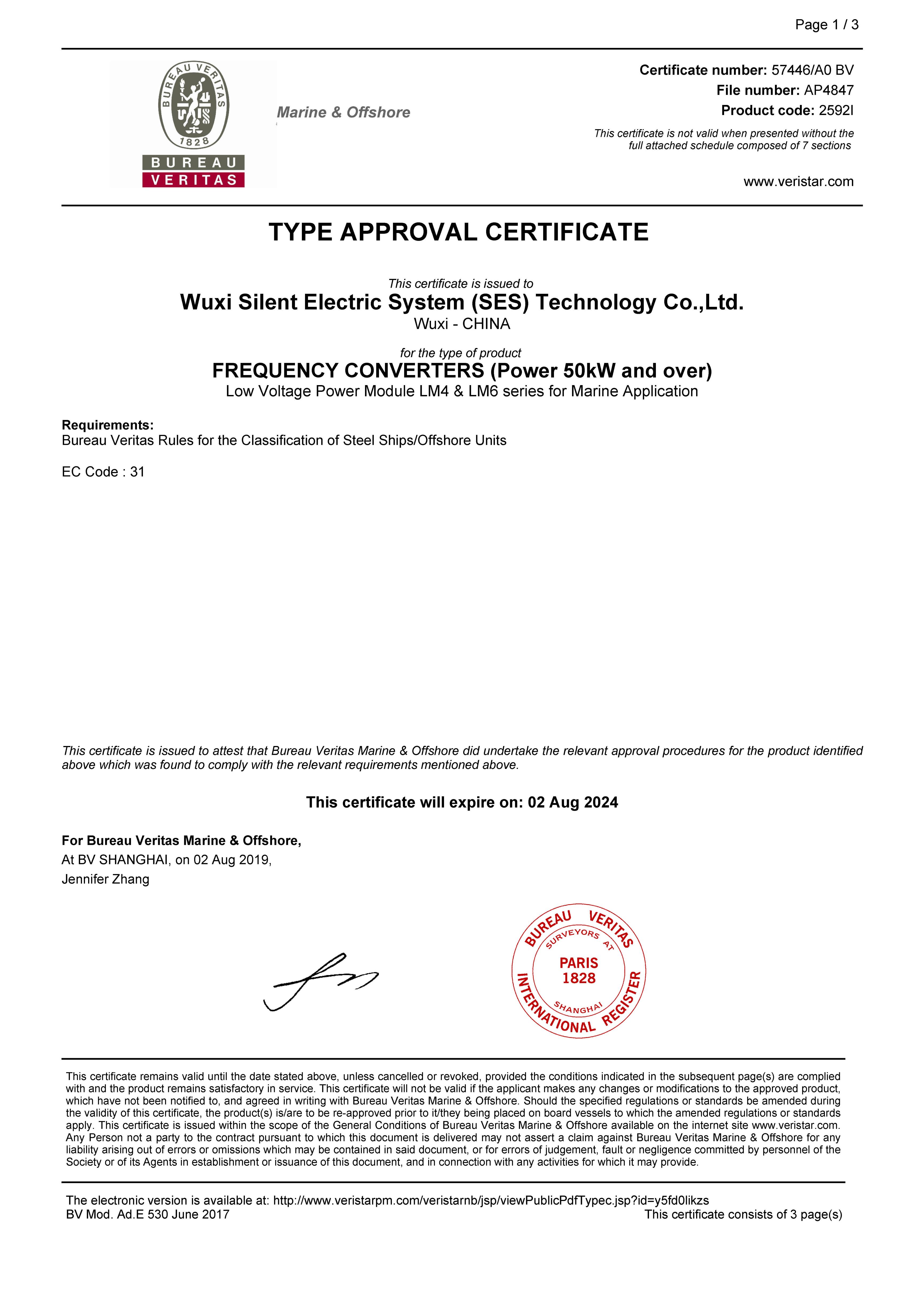 公司獲法國船級社船用變頻器型式認可證書