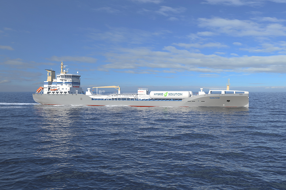 15000噸雙燃料化學品船總長147米,型寬22米,服務航速14.5節(jié),續(xù)航力6600海里,入級BV船級社,混合動力系統(tǒng)配備電池(424kWh),抱軸電機額定功率為1000kW,采用雙殼單甲板單機單槳設(shè)計,是新一代的HYBRID船型。