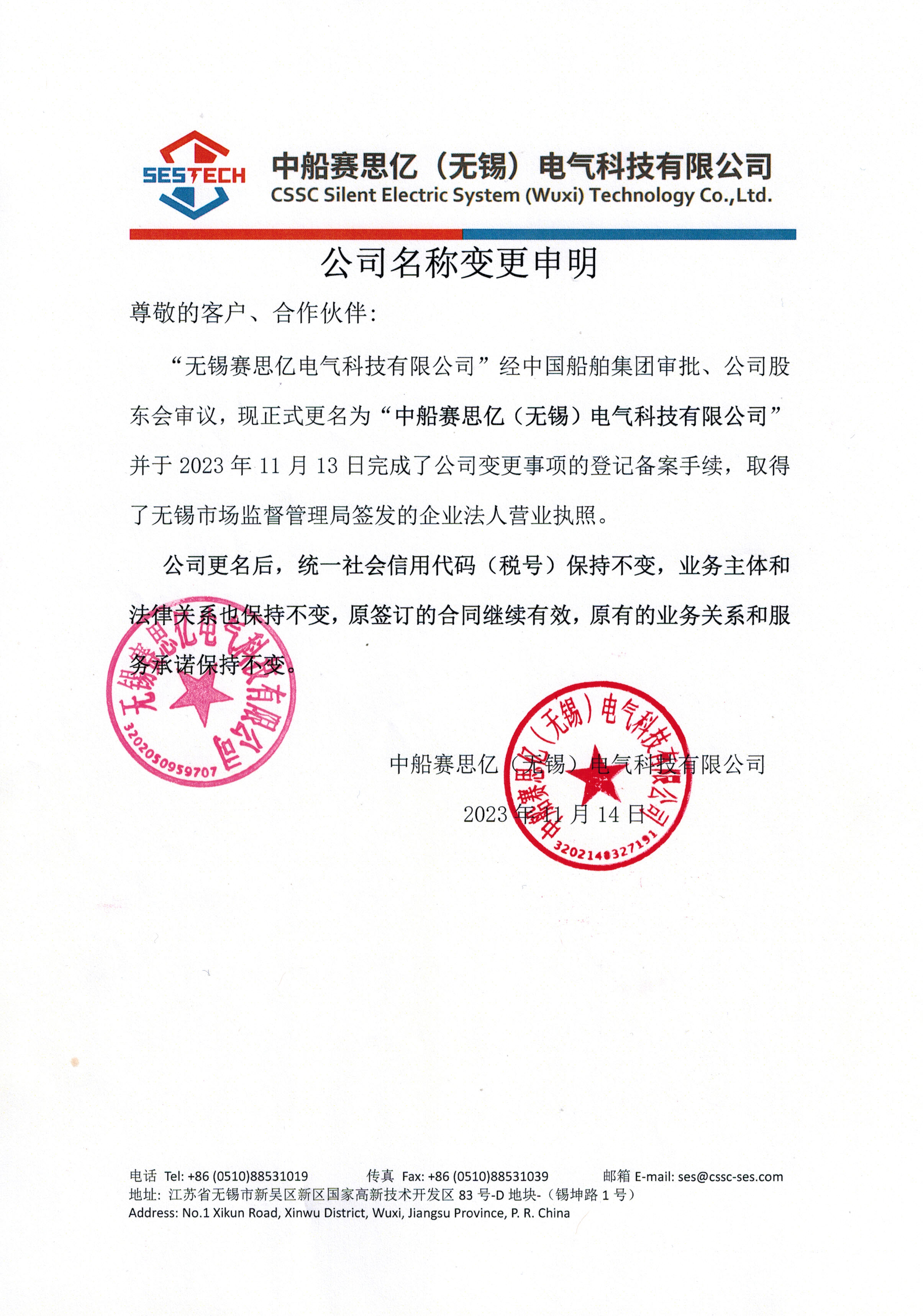 經(jīng)中國船舶集團審批、公司股東會審議,2023年11月13日,無錫賽思億電氣科技有限公司正式取得無錫市場監(jiān)督管理局簽發(fā)的企業(yè)法人營業(yè)執(zhí)照,更名為“中船賽思億(無錫)電氣科技有限公司”,簡稱“中船賽思億”。
