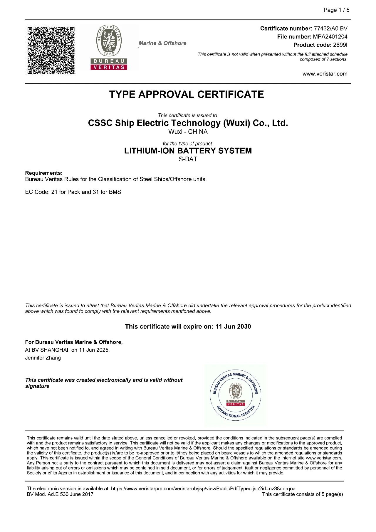 2025年6月11日,中船賽思億(無錫)電氣科技有限公司(CSSC Ship Electric Technology ( Wuxi) Co.,Ltd.)磷酸鐵鋰電池系統(tǒng)順利取得法國船級(jí)社 (BV) 型式認(rèn)可證書,是中船賽思億進(jìn)軍國際船舶建造項(xiàng)目的一塊強(qiáng)有力的“敲門磚”。截至目前,中船賽思億憑借強(qiáng)大的技術(shù)攻堅(jiān)能力,已實(shí)現(xiàn)自產(chǎn)電池包(模組兼容寧德時(shí)代、億緯鋰能等品牌)及BMS電池管理系統(tǒng)全系列產(chǎn)品的全覆蓋,且均已順利取得中國船級(jí)社(CCS)、法國船級(jí)社(BV)兩大主流船級(jí)社型式認(rèn)可證書,對(duì)中船賽思億深耕海內(nèi)外綠色船舶市場(chǎng)開拓具有重要意義。