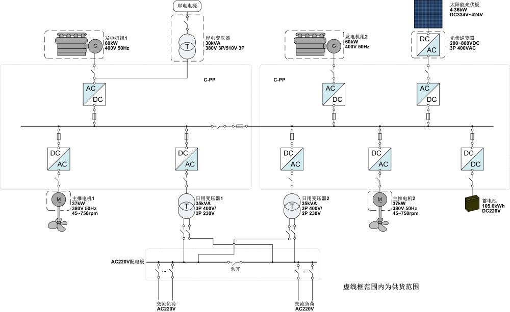 批量四海風(fēng)行豪華游艇,整個(gè)動(dòng)力系統(tǒng)配置2臺(tái)60kW的柴油機(jī)組、一套4.6kW的太陽(yáng)能光伏板、一組105.6kWh的蓄電池組和2臺(tái)37kW的主推進(jìn)電機(jī)。在觀光工況下,發(fā)電機(jī)組停止工作,使用蓄電池和太陽(yáng)能為全船供電,可使用蓄電池組連續(xù)推進(jìn)5小時(shí)左右,零排放、振動(dòng)噪音小并且船員舒適性較好。