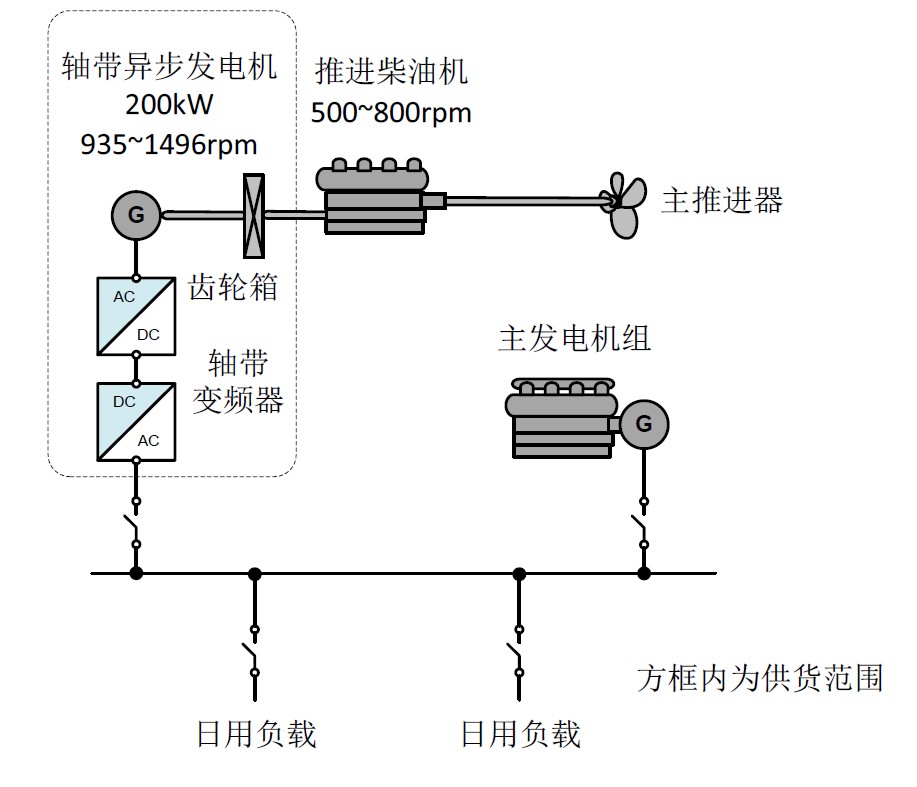 高欄01/02散貨船,采用S-Hybrid 主機(jī)+電力推進(jìn)混合動力系統(tǒng),在不改變船舶原有主機(jī)動力形式的前提下,充分利用船舶在遠(yuǎn)洋航線的經(jīng)濟(jì)航速工況,通過主機(jī)冗余功率帶動異步電機(jī)發(fā)電運(yùn)行,在提高主機(jī)負(fù)荷率改善其油耗的同時,可以關(guān)停船舶輔機(jī),節(jié)省了船舶的運(yùn)營油耗。